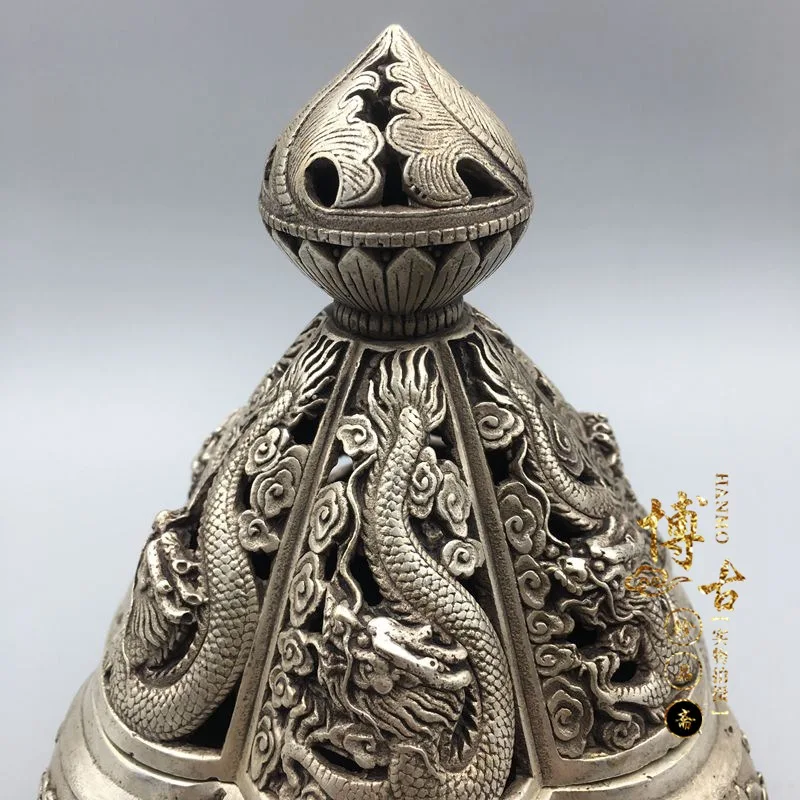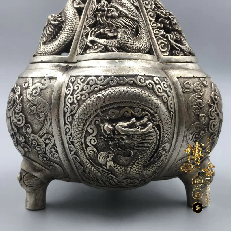 China's rare miao silver Kowloon incense burner statue family living room home decoration metal cra
